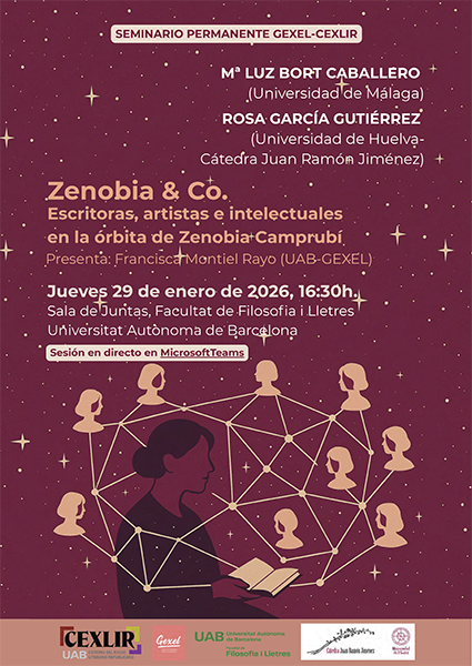 Contaremos con la presencia de Rosa García Gutiérrez, directora de la Cátedra Juan Ramón Jiménez de la Universidad de Huelva, y Mª Luz Bort Caballero, de la Universidad de Málaga, editora del libro Zenobia & Co. Escritoras, artistas e intelectuales en la órbita de Zenobia Camprubí (Huelva, Universidad de Huelva, 2025), sobre el que versará la sesión.